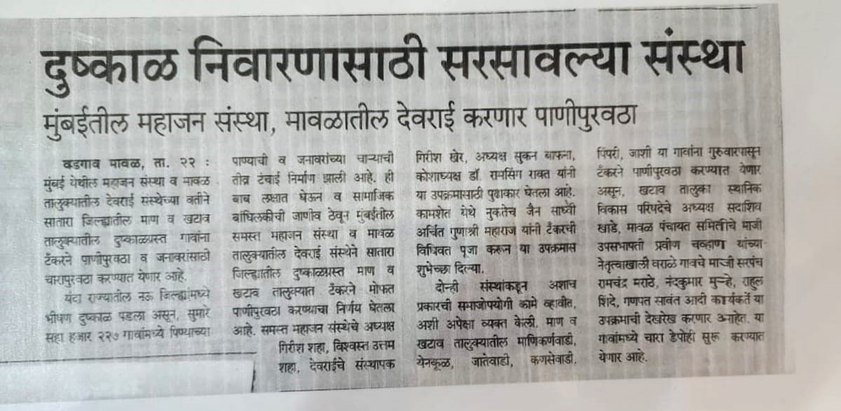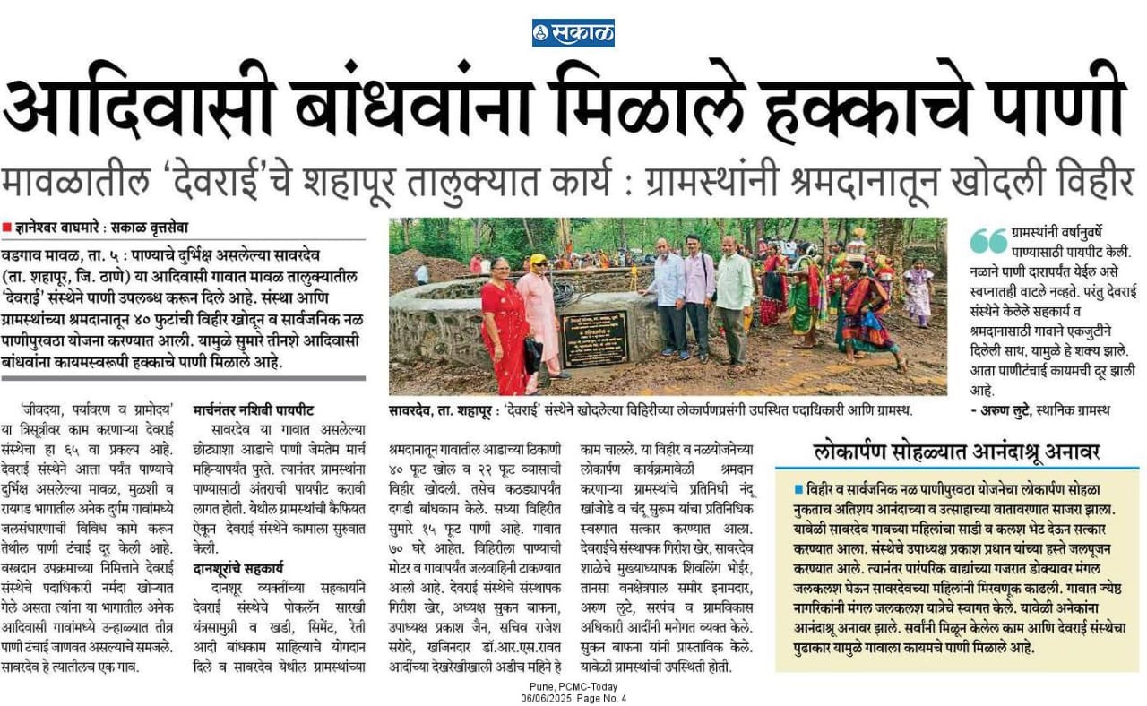 याप्रसंगी देवराई संस्था अध्यक्ष श्री सुकन शेठ बाफना गिरीष तात्या खेर ,राजेश सरोदे, नामदेव आंदै, हिम्मत शेट पुरोहित , शिरीष कुलकर्णी ईत्यादी उपस्थित होते.